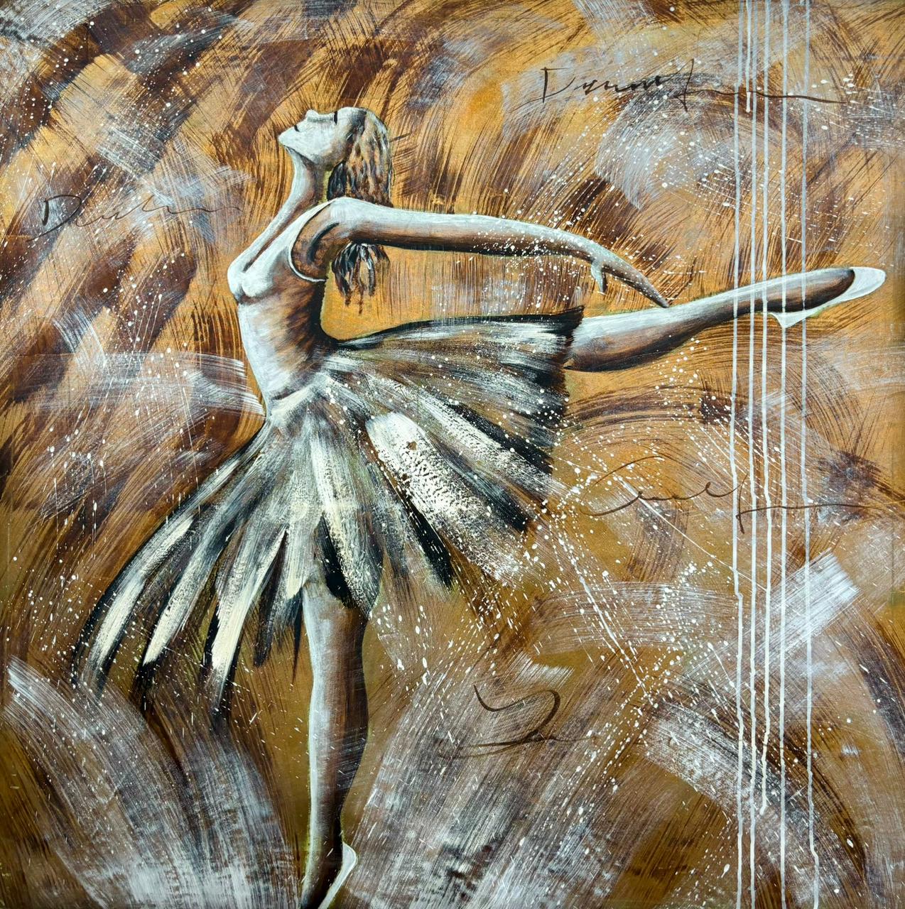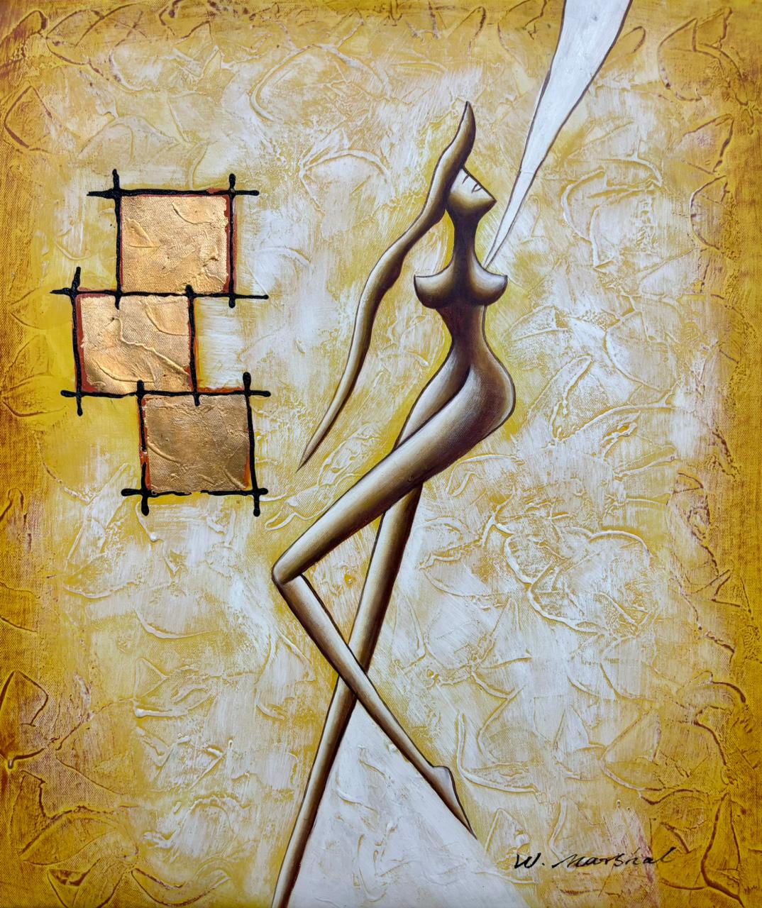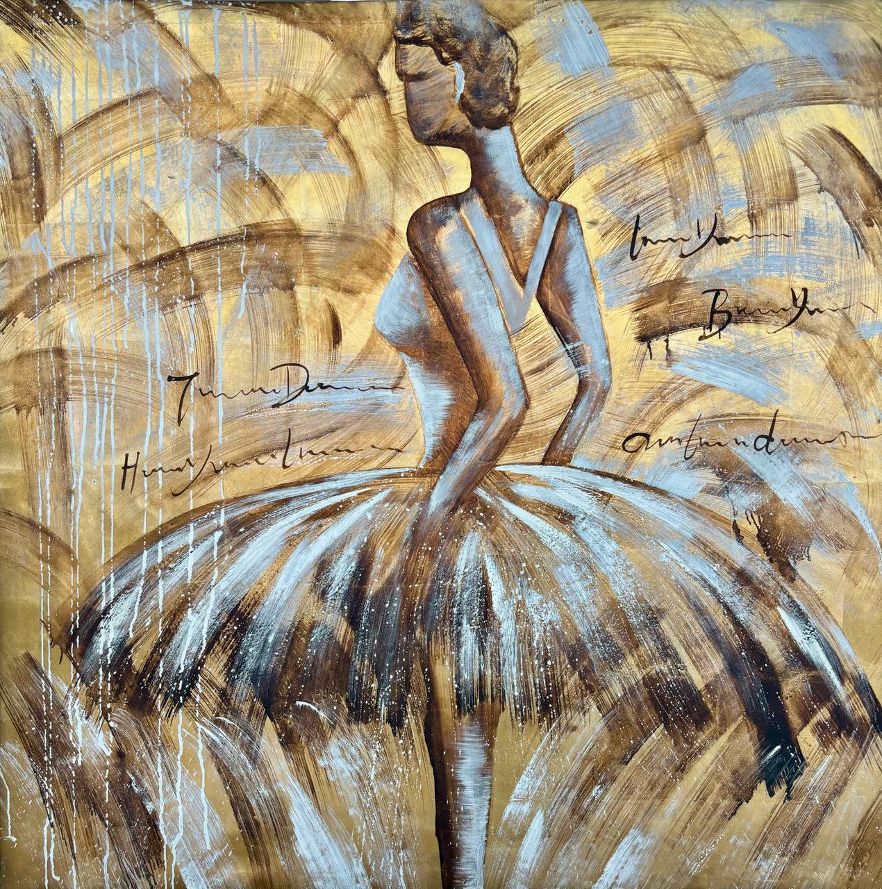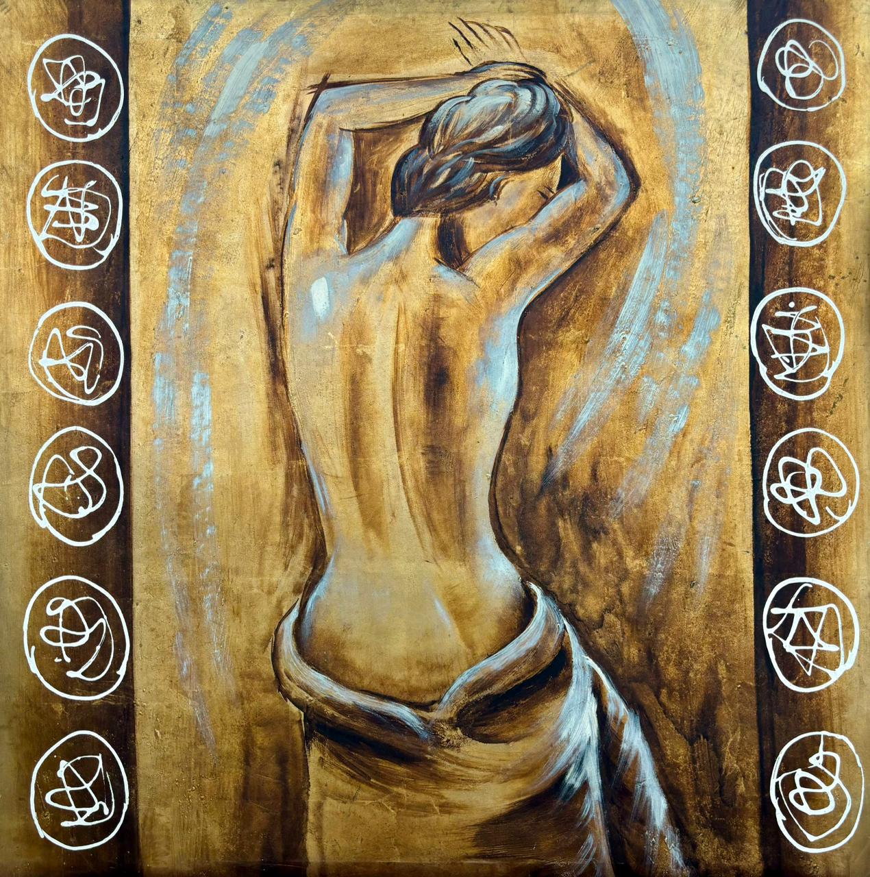 Nesta tela, o dourado adiciona um ar clássico à temática, enquanto as pinceladas soltas em tons neutros acrescentam sofisticação e dinamismo ao estilo contemporâneo.