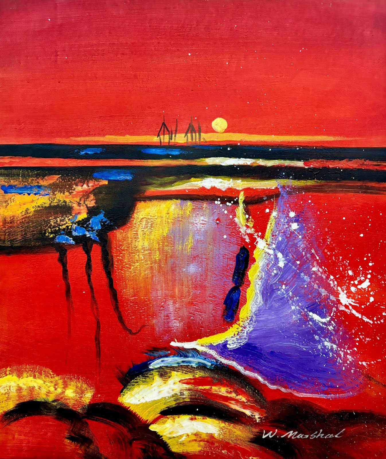 Nesta belíssima representação do movimento do mar, o protagonismo é da tonalidade rubra dos últimos momentos do sol, evocando dinamicidade e calor.