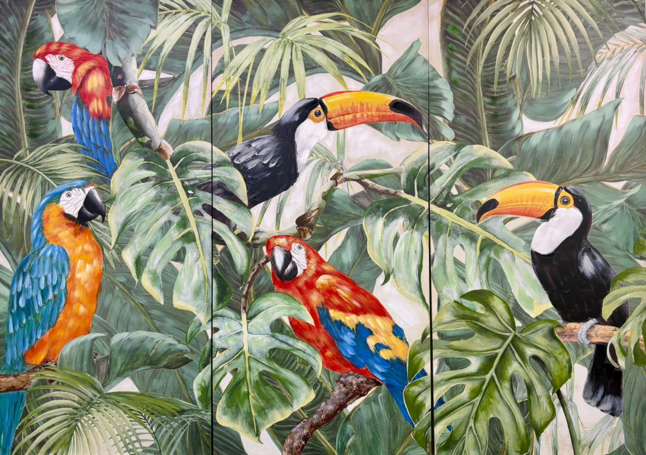 Nesta deslumbrante coleção em painel, a natureza tropical é retratada em sua majestade de cores e formas. Espécies representantes da fauna brasileira tomam destaque por entre a frondosa abundância vegetal.